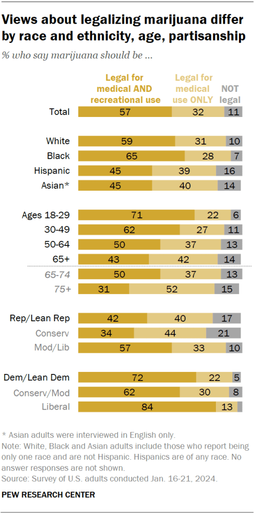 Race and ethnicity introduce additional complexity, with Hispanic and Asian Americans showing more caution, at 45% support for full legalization, while Black and White Americans are more supportive, at 65% and 59% respectively. These numbers reflect a nation undergoing a significant shift, highlighting the complex social and cultural dynamics at play.