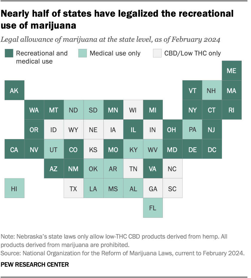 Legalization is spreading across the country, with 24 states and the District of Columbia legalizing both medical and recreational use. This green wave means over half of the U.S. population lives in states where they can legally indulge for any reason, with nearly 15,000 dispensaries making access easier than ever.