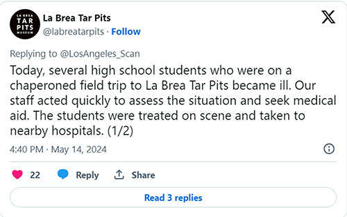 La Brea Tar Pits staff quickly assessed the situation and sought medical aid, as they shared in a post on X (formerly known as Twitter): “We extend our care and concern to the students and their families and wish them a healthy recovery.” A heartwarming message, sure, but perhaps a tad over the top for a bunch of teenagers who just overdid it on some edibles.