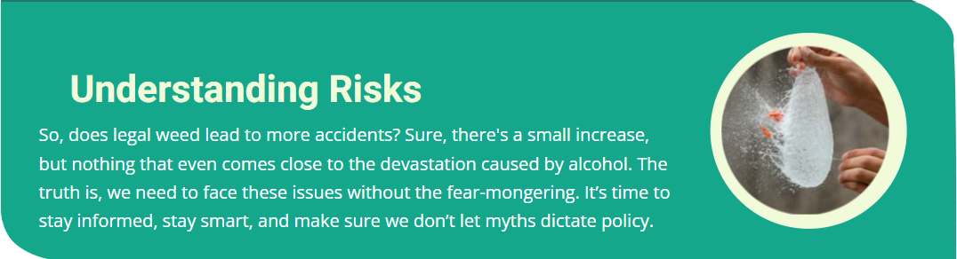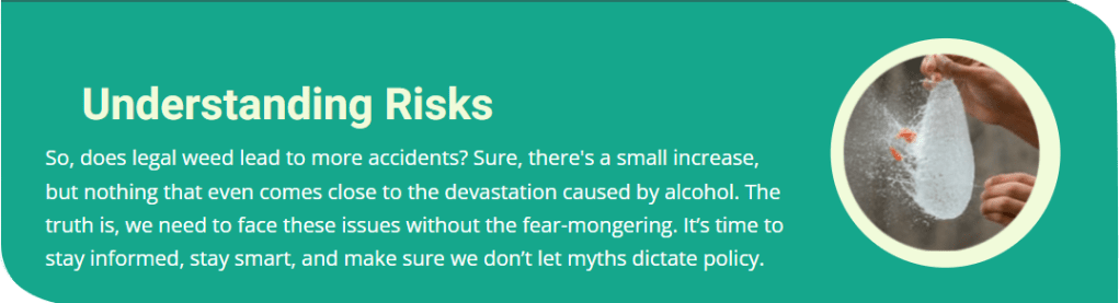 So, does legal weed lead to more accidents? Sure, there’s a small increase, but nothing that even comes close to the devastation caused by alcohol. The truth is, we need to face these issues without the fear-mongering. It’s time to stay informed, stay smart, and make sure we don’t let myths dictate policy.