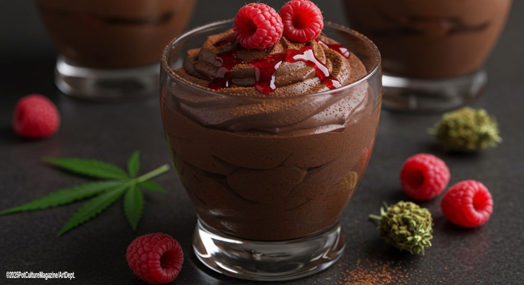 A smooth, decadent chocolate dessert with a tart raspberry drizzle and a gentle cannabis infusion.