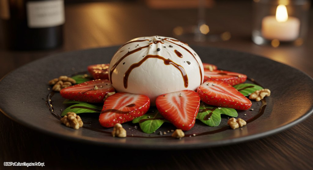 A sweet and savory salad to start, featuring juicy strawberries, creamy burrata, peppery arugula, and a THC-infused balsamic glaze.