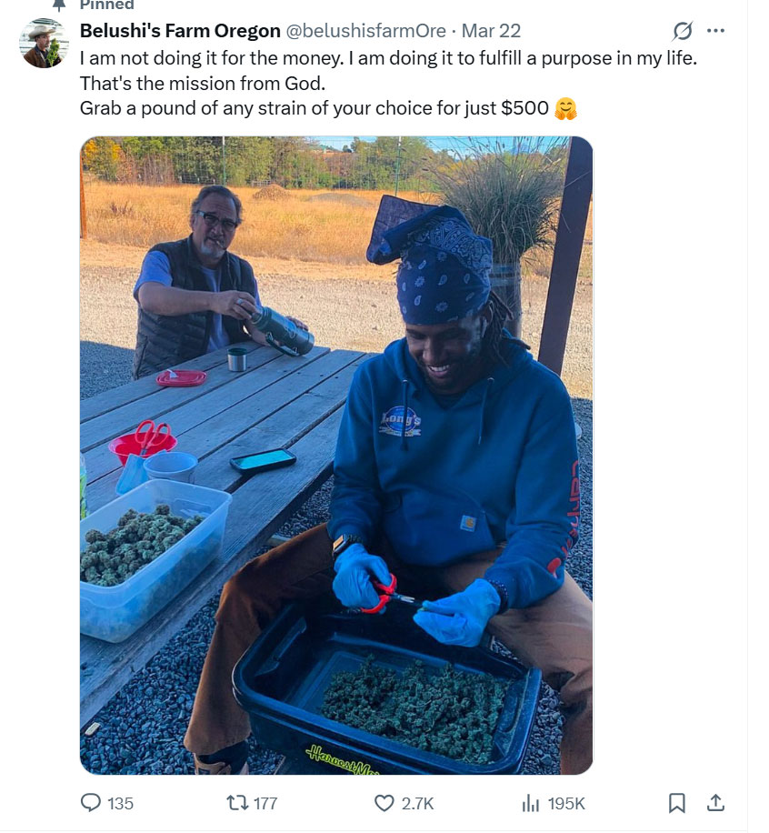 It’s not the first time those words have been used to roll out a celebrity cannabis venture. In 2022, Jim Belushi used almost identical language when promoting his 500 pounds of Oregon-grown flower: “It’s a mission from God.” He tweeted it. It trended. And then the price tag spoke for itself.