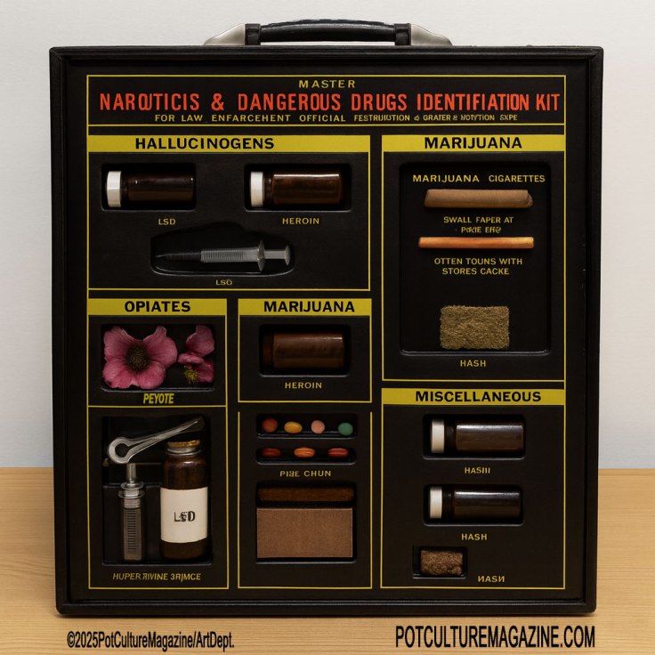 The case opened like something out of an Indiana Jones movie. Think Raiders of the Lost Ark, when the Ark gets opened and everyone stares in awe, right before all hell breaks loose. Now, swap the gold for ziplocks and vials. Inside that hard plastic mold was a visual parade of every forbidden substance the eighties could imagine: cocaine, heroin, weed (looked like backyard clippings), LSD, mushrooms, pills with government names, even acid tabs laminated like they came from a menu. A full-spectrum buffet of doom and damnation.