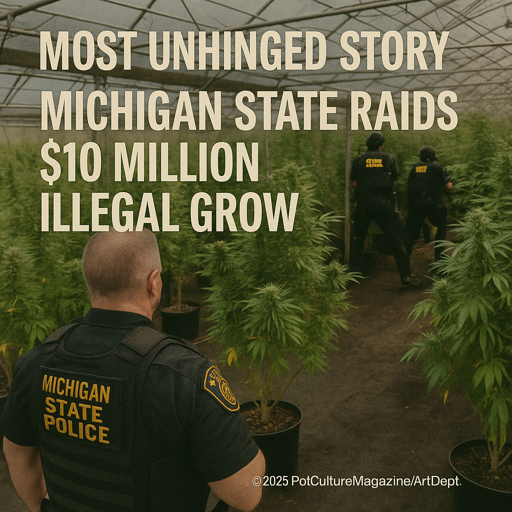 Michigan State Police raided an unlicensed grow in Baldwin, seizing over 13,400 plants and hundreds of pounds of flower from a 17,000-square-foot facility on 19 acres. Estimated street value: over $10 million.
