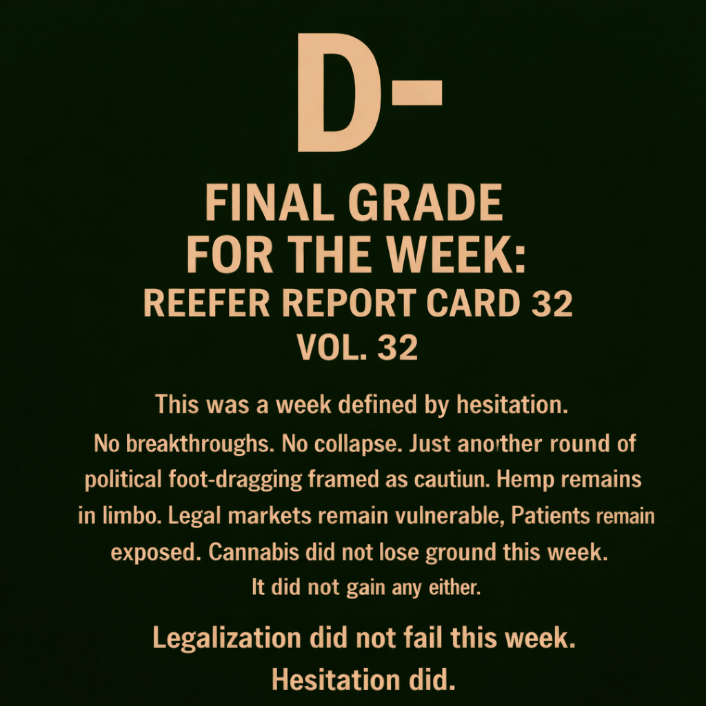 Reefer Report Card Vol. 31 examines a week where cannabis reform quietly retreated. Ballot rollbacks gained traction, federal action stalled, and patients remained unprotected. Legal weed stayed popular, but oversight weakened and accountability slipped. Another week where legalization survived while governance failed