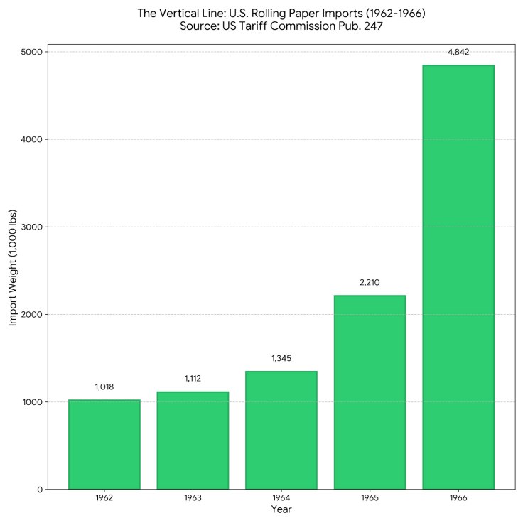 Rolling paper imports surged throughout the early 1960s, which Rosenthal viewed as an indicator that cannabis use was rising just as quickly.